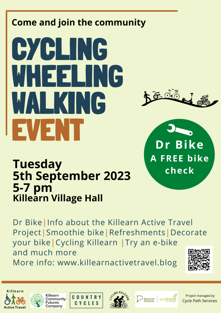 Come along to the Killearn Active Travel, cycling, wheeling and walking event on Tuesday 5 September in Killearn Village Hall from 5-7pm.